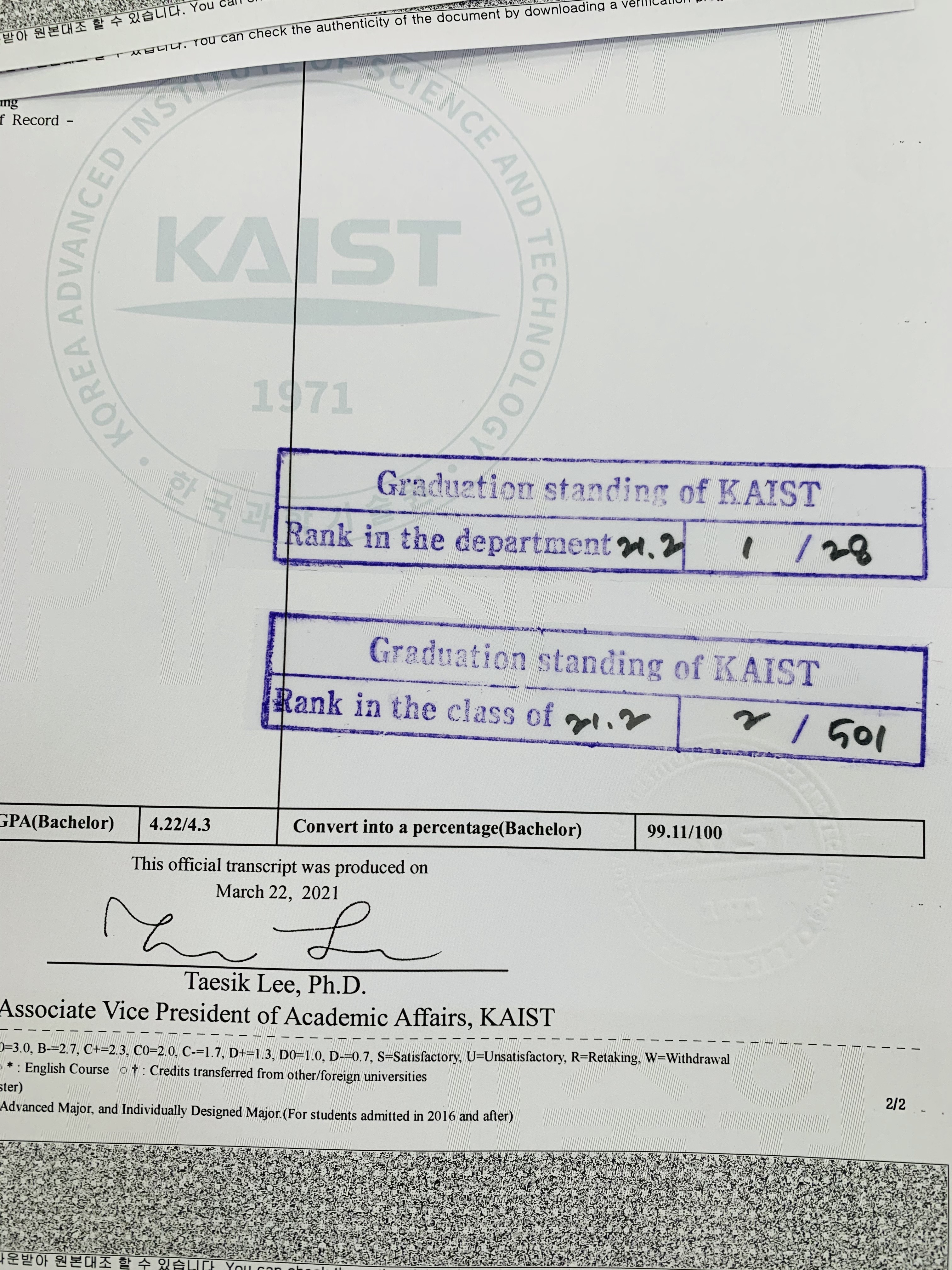 으로 졸업했다. 사실 졸업은 지난달에 했는데, 오늘 졸업 관련 서류들을 스캔하다가 졸업순위를 확인하게 되었다. 학교 성적, 특히 순위에 별다른 의미를 두지는 않지만, 그래도 학부생활을 잘 마친 것 같아서 뿌듯한 마음이다. 앞으로 더 성장해나갈 수 있으면 좋겠다.